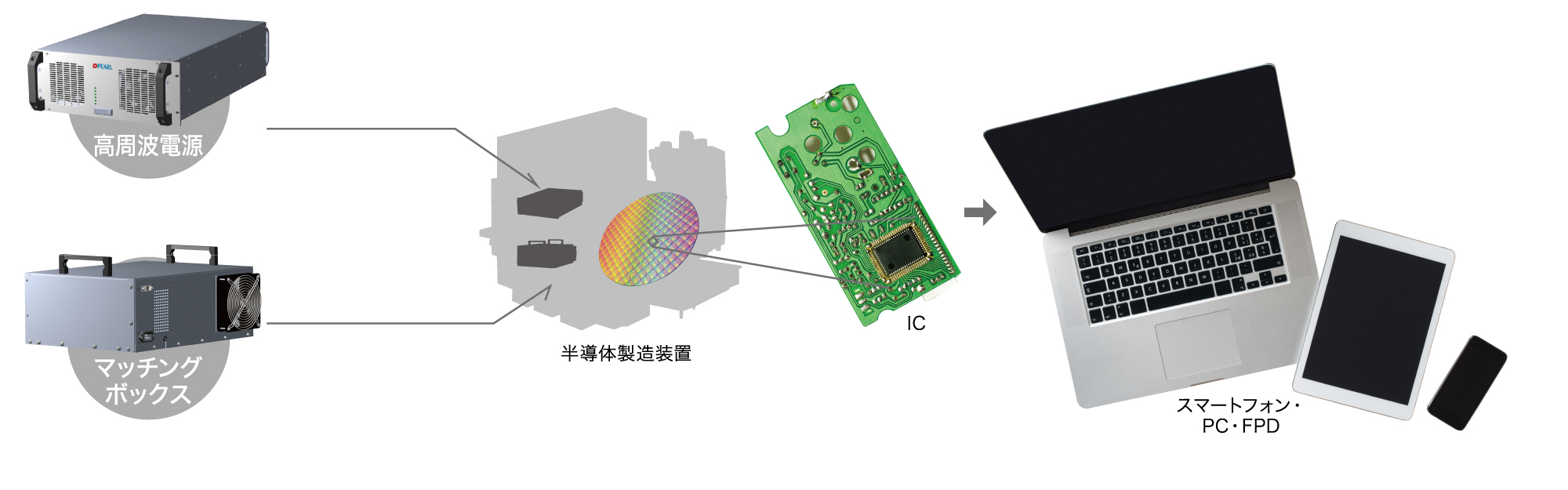 日常生活やビジネスシーンで今や欠かすことができないPCやスマートフォン。他にも様々な電子・電気機器がありますが、それらを動かす頭脳となるのが半導体です。私たちの高周波テクノロジーは革新的スピードで進化する半導体の製造現場を支えています。